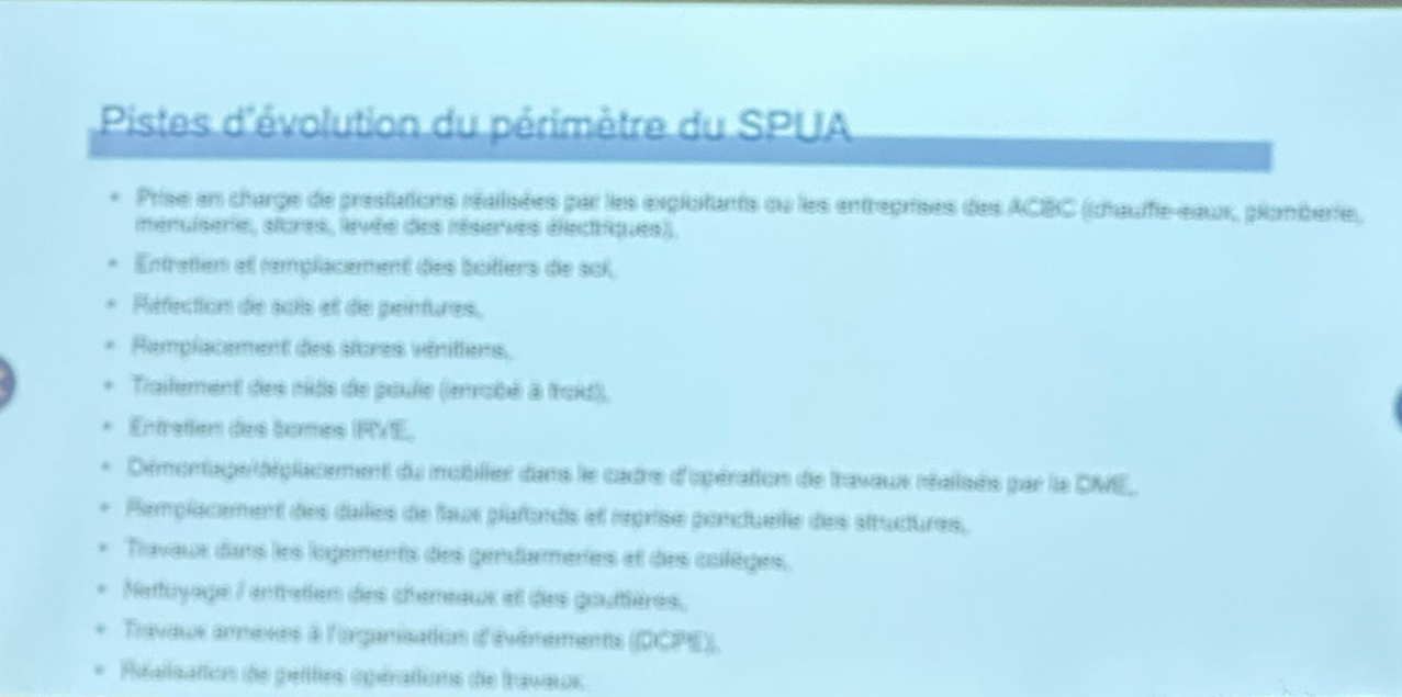 La finalisation de la construction des MBA va réduire considérablement l'activité du SPUA, aussi il est décidé de réorganiser le SPUA (voir organigramme) afin de répondre aux besoins des # de façon optimum.