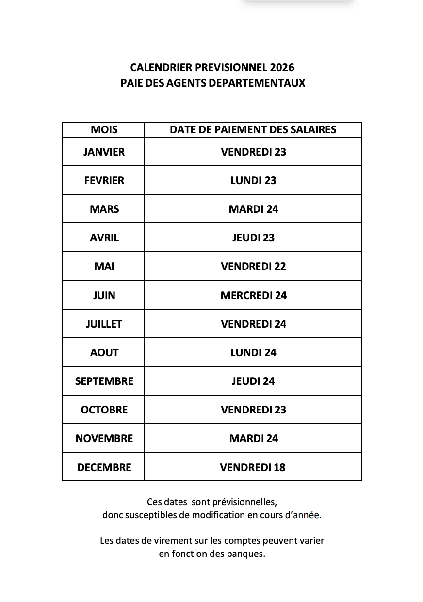CALENDRIER PREVISIONNEL 2026 / PAIE DES AGENTS DEPARTEMENTAUX