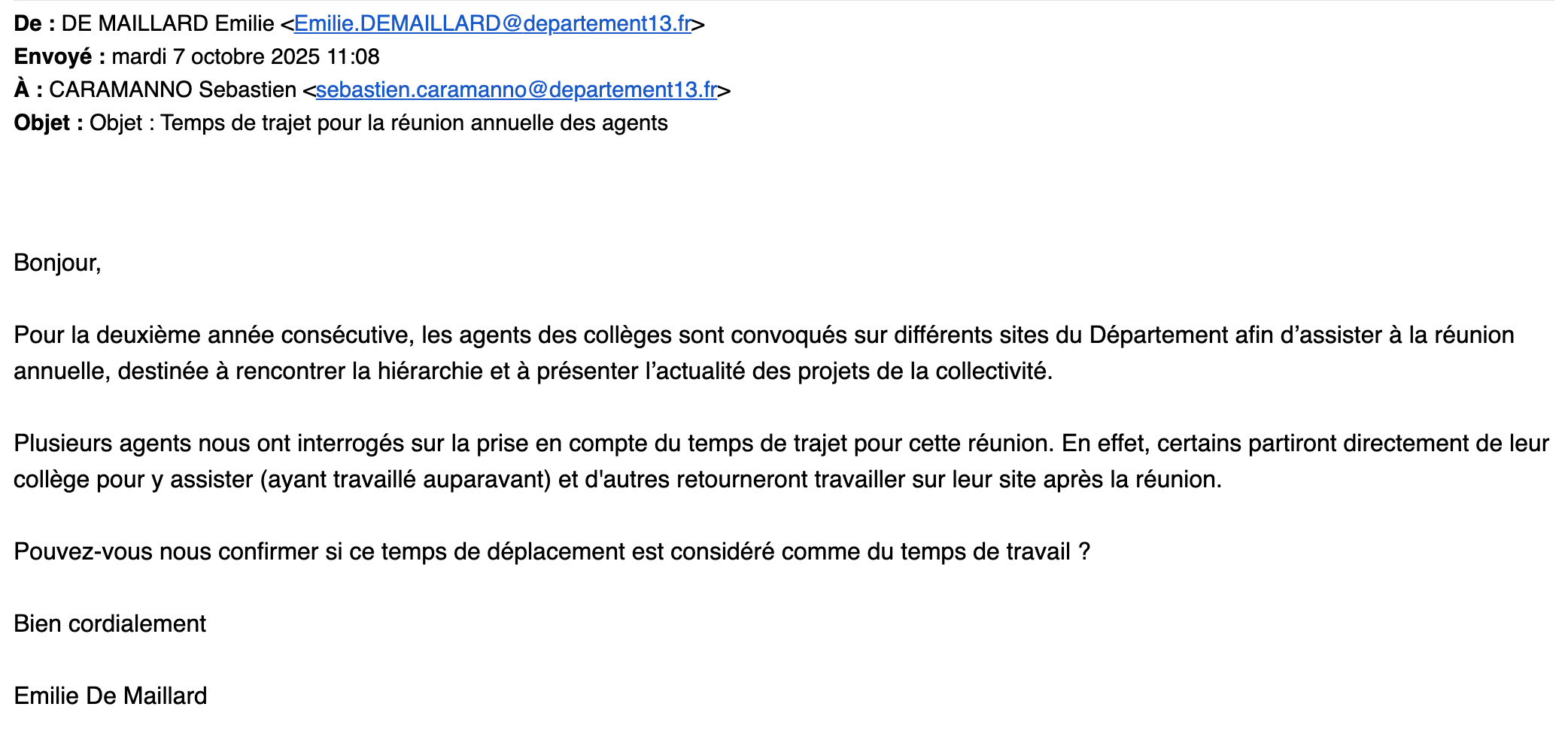 AGENTS DES COLLEGES / DEMANDE UNSA CD13 SUR LA PRISE EN COMPTE DU TEMPS DE TRAJET A/R DANS LE TEMPS DE TRAVAIL POUR ASSISTER AUX REUNIONS IMPOSEES AU ATC PAR LA DEC CD13