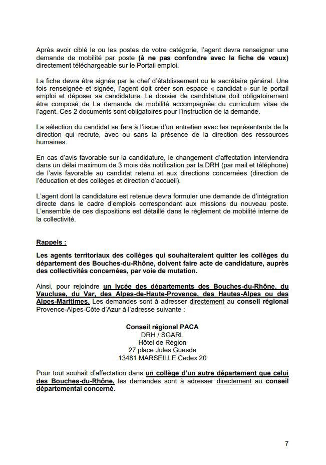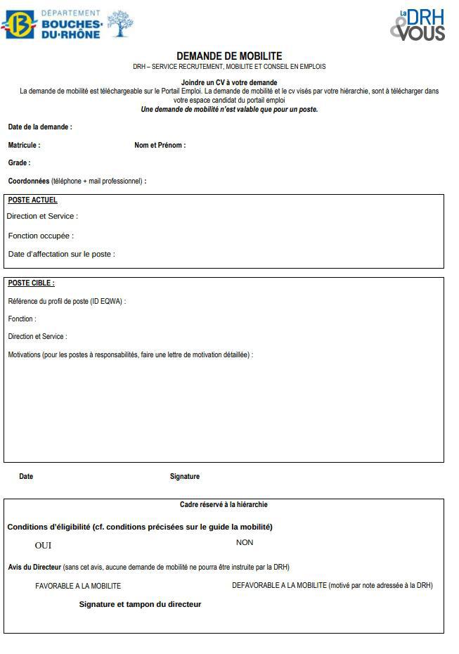 L’agent souhaitant faire acte de candidature devra compléter une fiche de mobilité disponible auprès du secrétaire général ou sur le Portail emploi accessible à l’adresse suivante : https://recrutement.departement13.fr/intranet/.