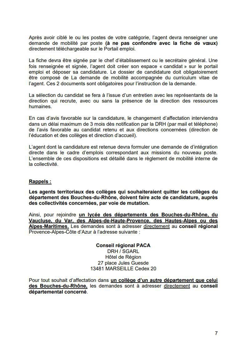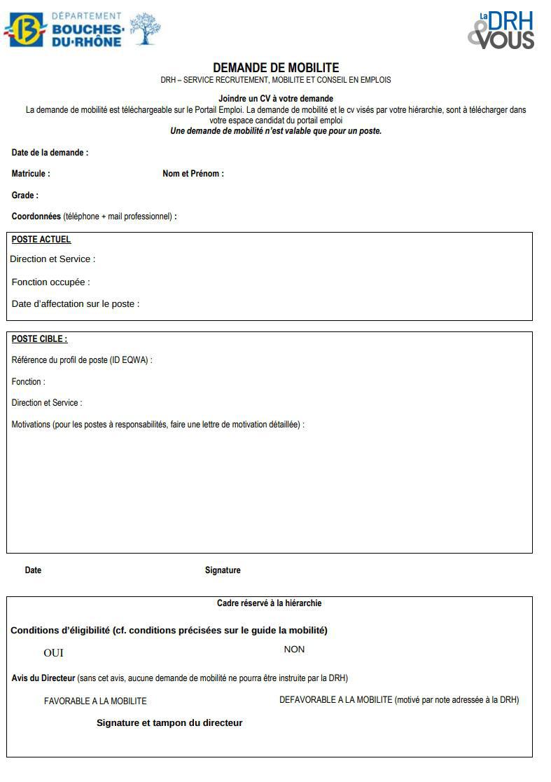 L’agent souhaitant faire acte de candidature devra compléter une fiche de mobilité disponible auprès du secrétaire général ou sur le Portail emploi accessible à l’adresse suivante : https://recrutement.departement13.fr/intranet/.