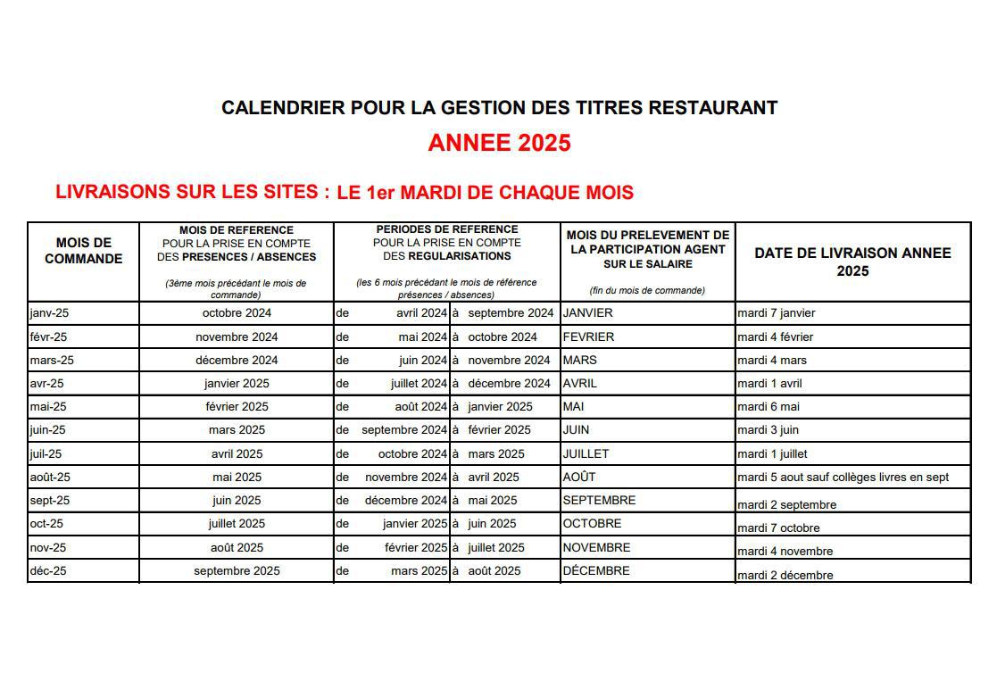 CALENDRIER POUR LA GESTION DES TITRES RESTAURANT ANNEE 2025