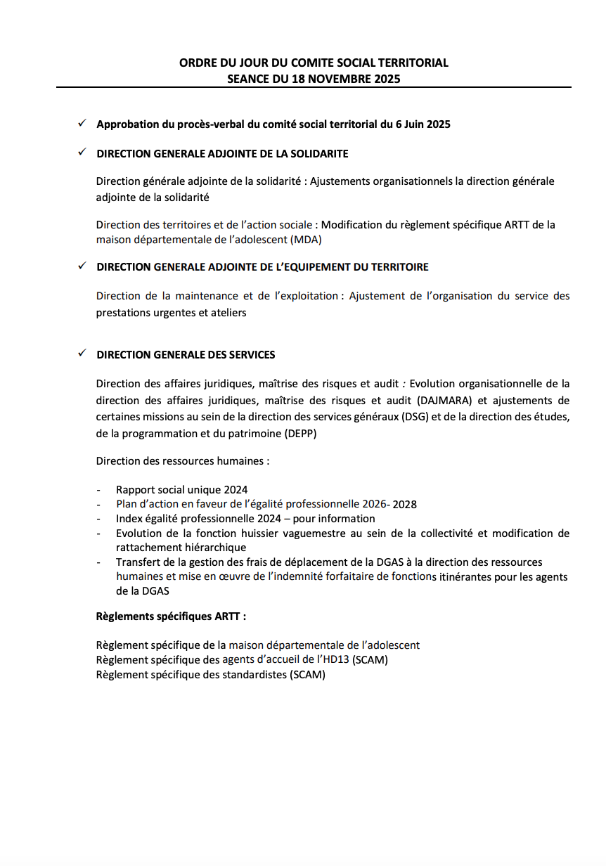 - la séance du pré-comité social territorial se tiendra le 12 novembre 2025 dans le prolongement de la séance du comité de suivi ARTT, à 10 H 00 en salle des séances plénières,
