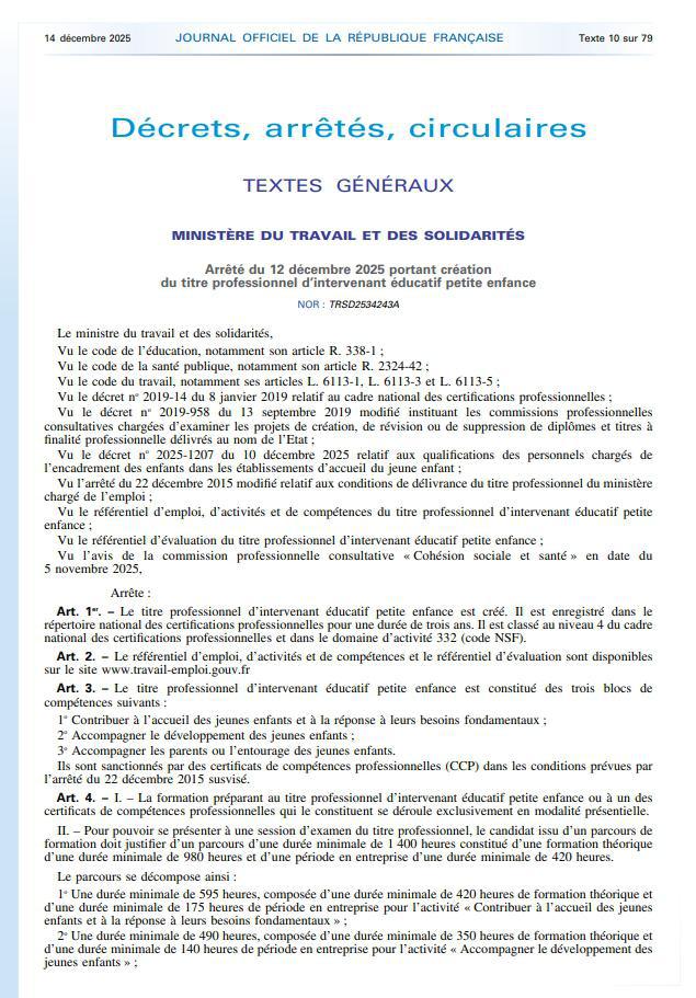 Le nouveau titre d’intervenant éducatif petite enfance est désormais inscrit au répertoire national des certifications professionnelles. Il peut être obtenu après une formation d’environ 1 400 heures, dont une part importante en stage, ou par validation des acquis de l’expérience (VAE).