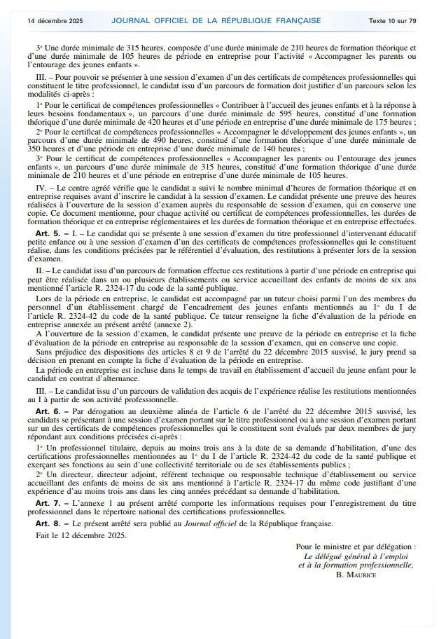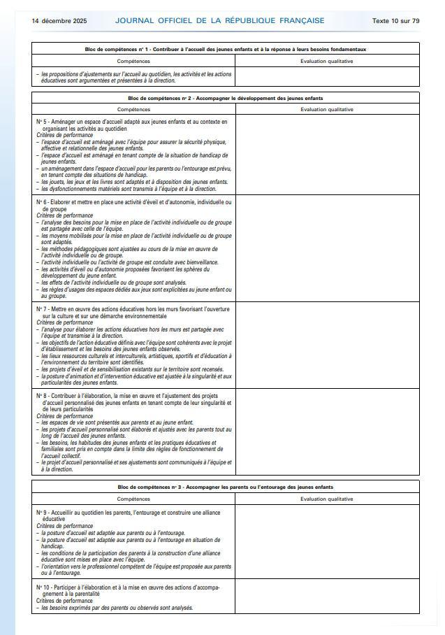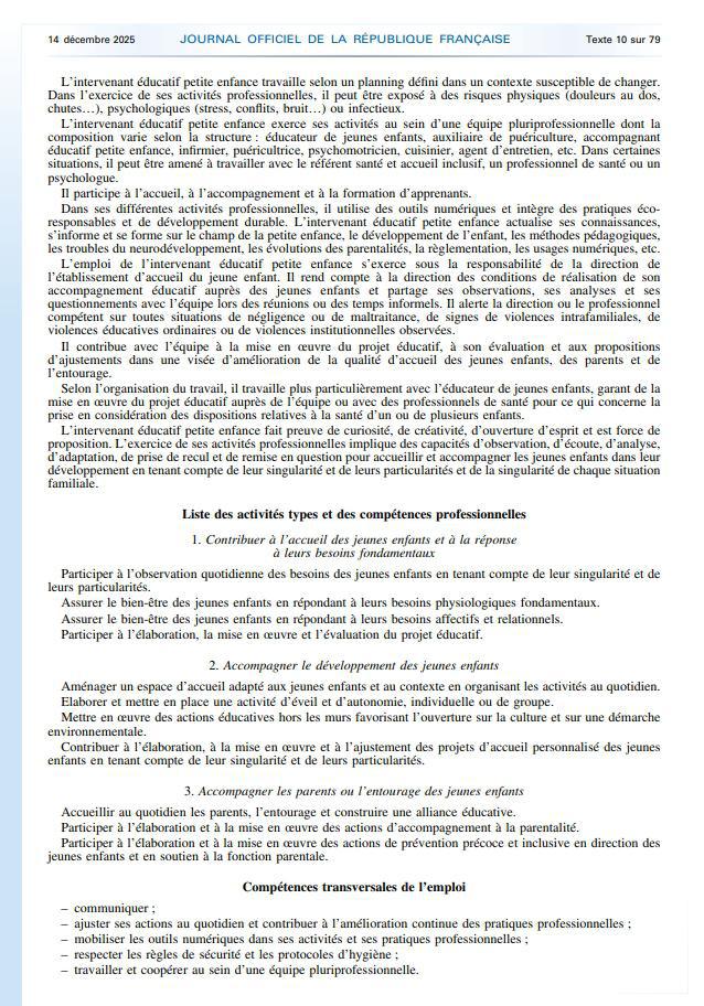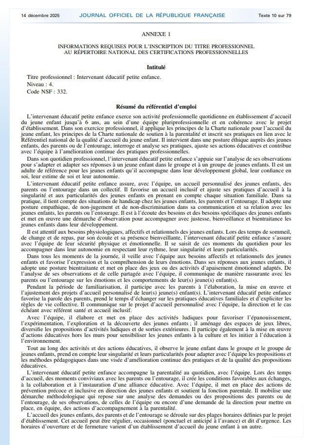 Le décret classe les titulaires de ce titre parmi les professionnels qualifiés pouvant encadrer les enfants, au même niveau réglementaire que des métiers reposant sur des diplômes d’État (auxiliaires de puériculture, éducateurs de jeunes enfants, infirmiers, psychomotriciens).