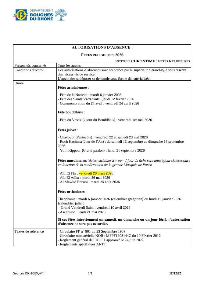 En effet, les autorisations d’absence pour fêtes religieuses sont prévues par la circulaire FP n°901 du 23 septembre 1967 et par la circulaire ministérielle du 10 février 2012, qui permettent aux agents de bénéficier d’une autorisation d’absence à l’occasion de certaines fêtes religieuses, sous réserve des nécessités de service.