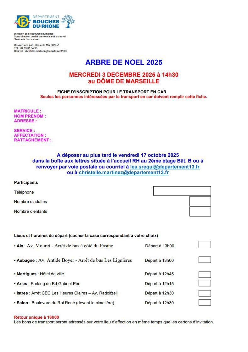 Pour les agents souhaitant bénéficier de ce transport, il convient de remplir la fiche d’inscription et d’en faire retour auprès de l’accueil RH au 2ème Etage Bât B ou à envoyer par courriel ou voie postale avant le 17 octobre 2025.