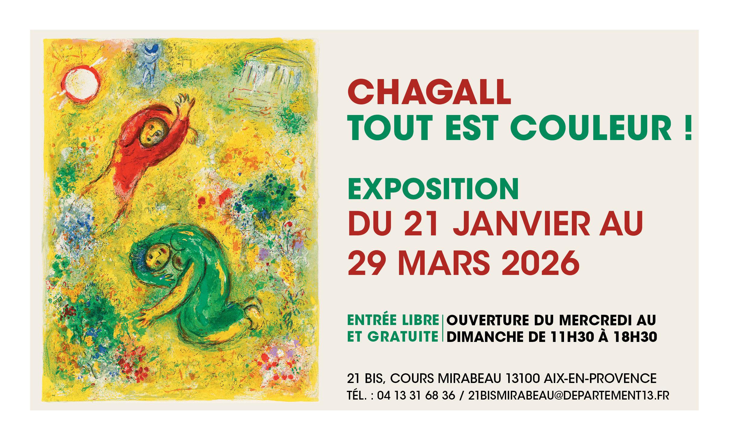Le 21, bis Mirabeau vous propose de découvrir une autre facette de l’estampe, grâce aux lithographies de Marc Chagall. Cette exposition est aussi l’occasion pour petits et grands de découvrir, ou redécouvrir de grands textes mythologiques, littéraires et religieux, autour des aventures d’Ulysse, de l’amour de Daphnis et Chloé, de l’Exode…