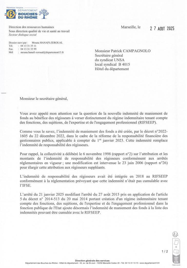 Réponse à UNSA - RIFSEEP régisseurs / DRH CD13 / 27 AOUT 2025